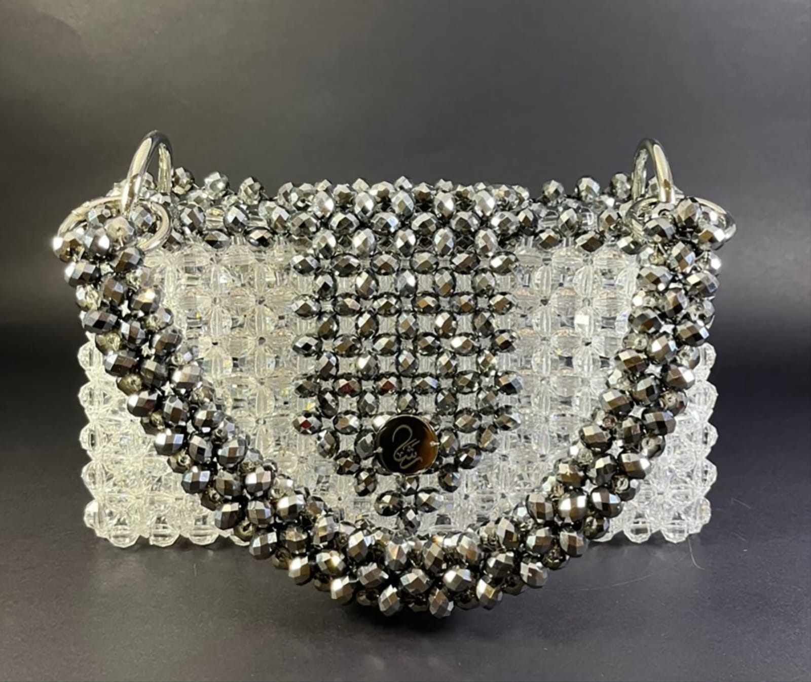 حقيبة مصنوعة يدوياً باستخدام كريستالات فضية وشفافة، تتميز بتصميم راقٍ وأنيق يجمع بين البساطة والفخامة، مما يجعلها قطعة مميزة لأي مناسبة. الحقيبة مصنوعة يدوياً بالكامل، مما يجعل كل قطعة فريدة ولا مثيل لها، مع استخدام كريستالات فضية وشفافة عالية الجودة لإبراز التصميم الراقي. يعكس التصميم البسيط والألوان الفضي والشفاف شخصية هادئة وواثقة، حيث يرمز اللون الفضي إلى الأناقة والرقي، بينما يعزز اللون الشفاف من شعور الصفاء والنقاء.