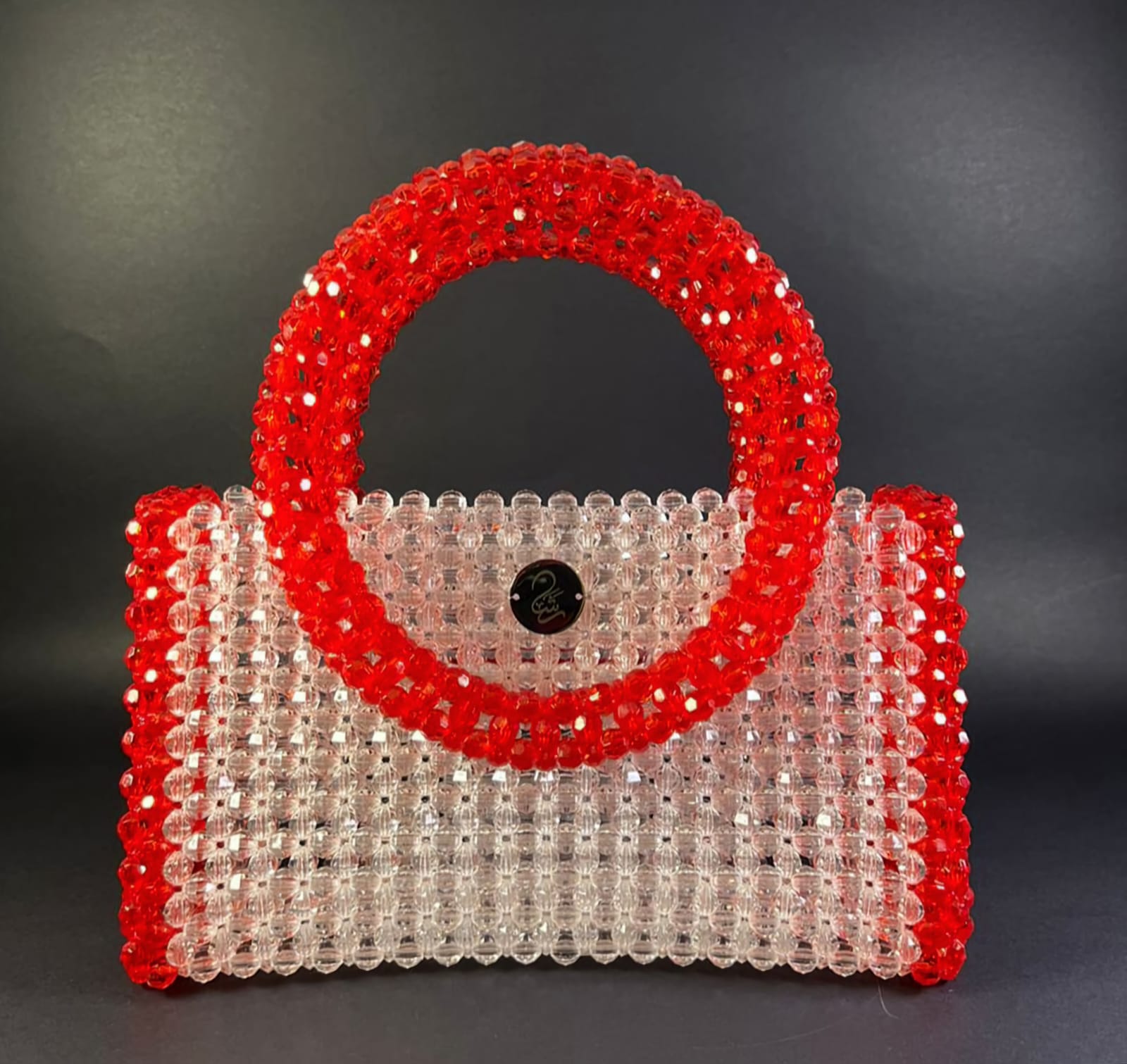 حقيبة مصنوعة يدوياً باستخدام كريستالات حمراء وشفافة، تتميز بتصميم جذاب وفريد من نوعه، تجمع بين الأناقة والفخامة لإضفاء لمسة مميزة على إطلالتك. الحقيبة مصنوعة يدوياً بالكامل مما يجعل كل قطعة فريدة ولا مثيل لها، مع استخدام كريستالات حمراء وشفافة عالية الجودة لإبراز التصميم الراقي. يعكس التصميم الجذاب والألوان الحمراء والشفافة شخصية جريئة وحيوية، حيث يرمز اللون الأحمر إلى القوة والشغف، بينما يعزز اللون الشفاف من شعور الصفاء والنقاء. التصميم بالانحناءات والدوائر يرمز إلى الأنوثة والرقي، مما يضفي طابعاً من الانسيابية والمرونة على الشخصية.